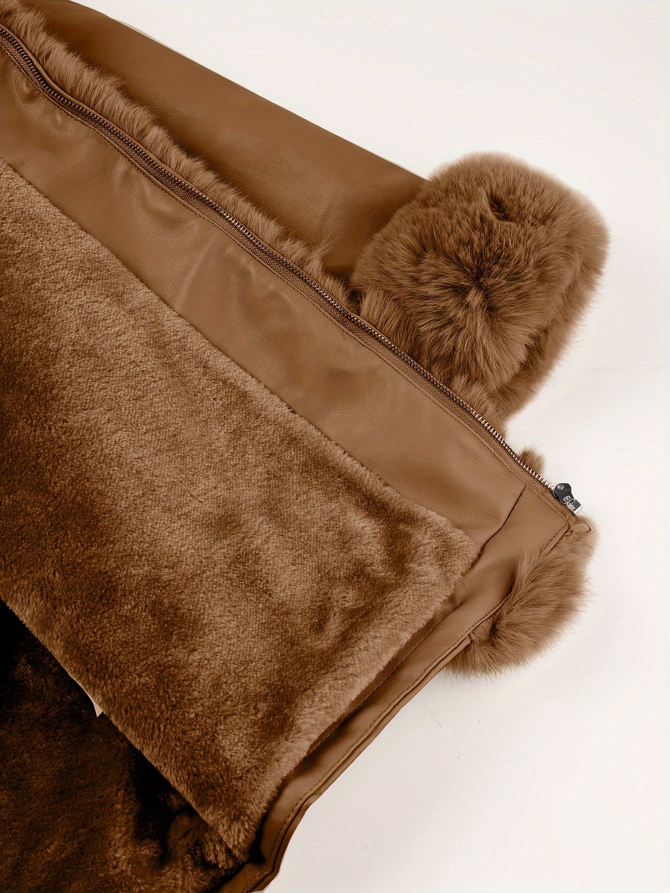 Women’s Elegant Genuine Leather Jacket – Suede Lining, Solid Color, Hooded Cold Weather Coat with Faux Fur Trim for Fall/Winter Outerwear