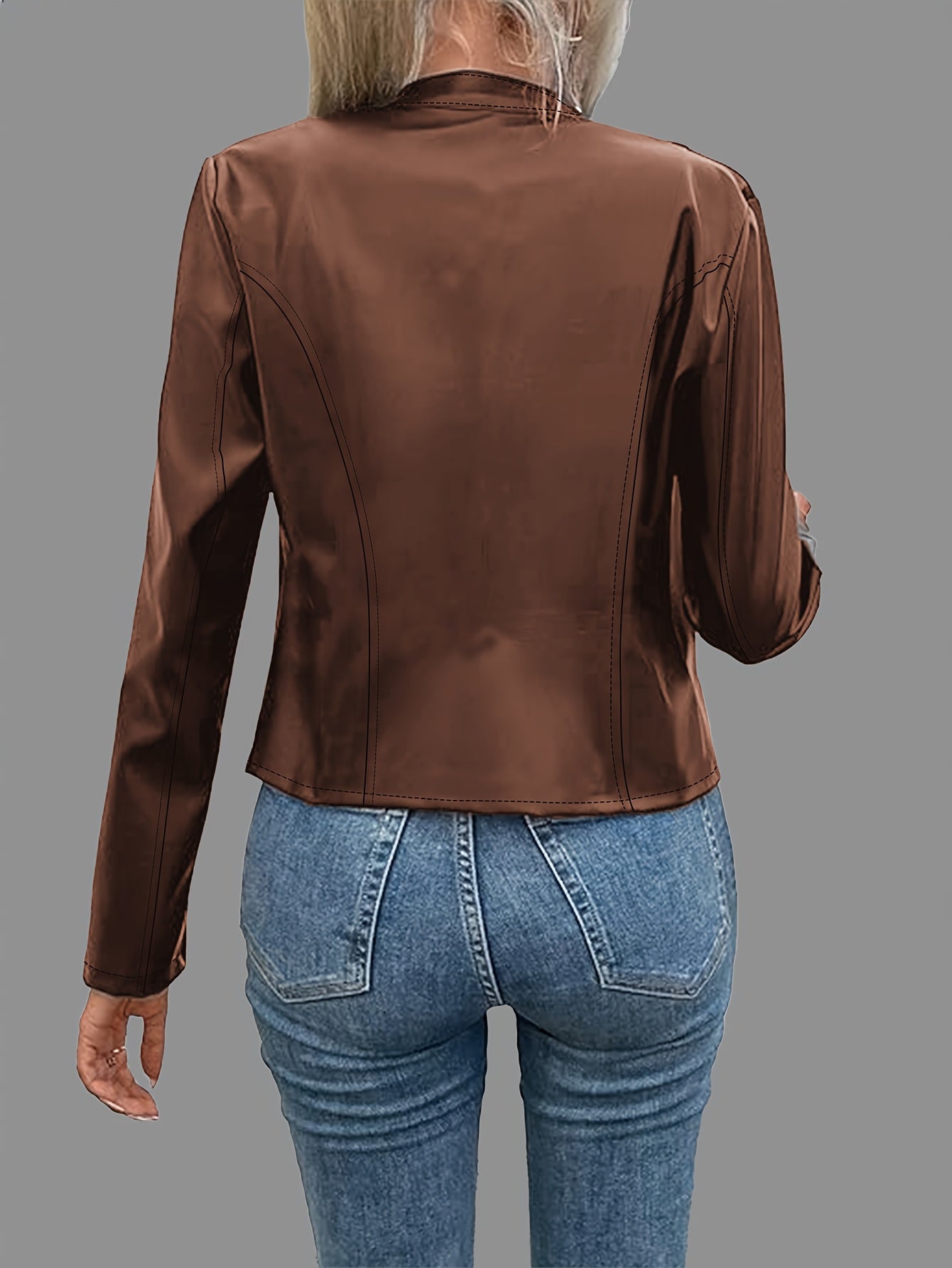 Women’s Elegant Genuine Leather Zip-Up Jacket – Long Sleeve Black Coat | Stylish Fall & Winter Outerwear, Chic Casual Jacket