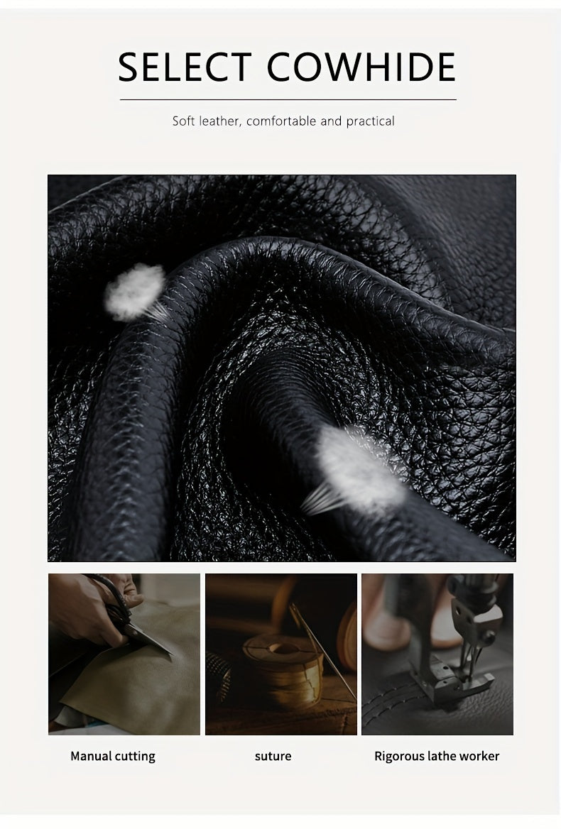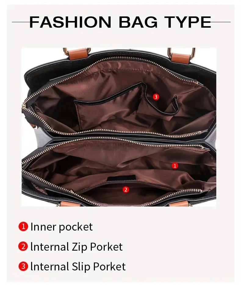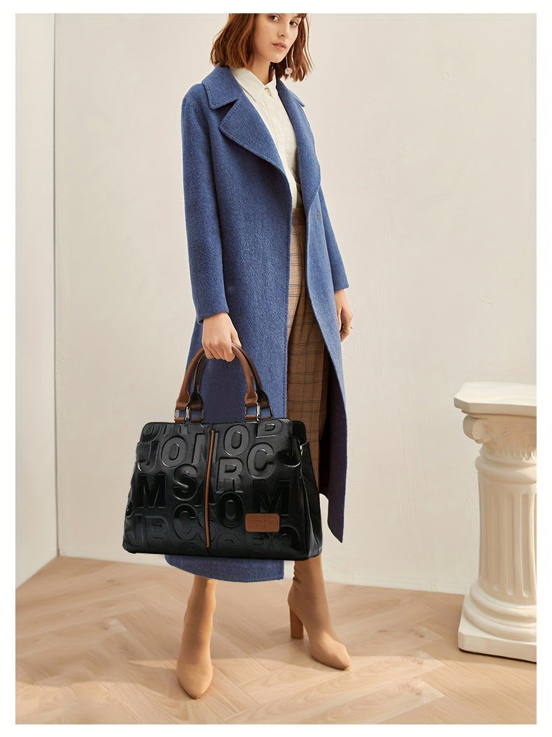 Women’s Genuine Leather Handbag – Black Tote with Brown Accents & Embossed Letter Design (Large Capacity)