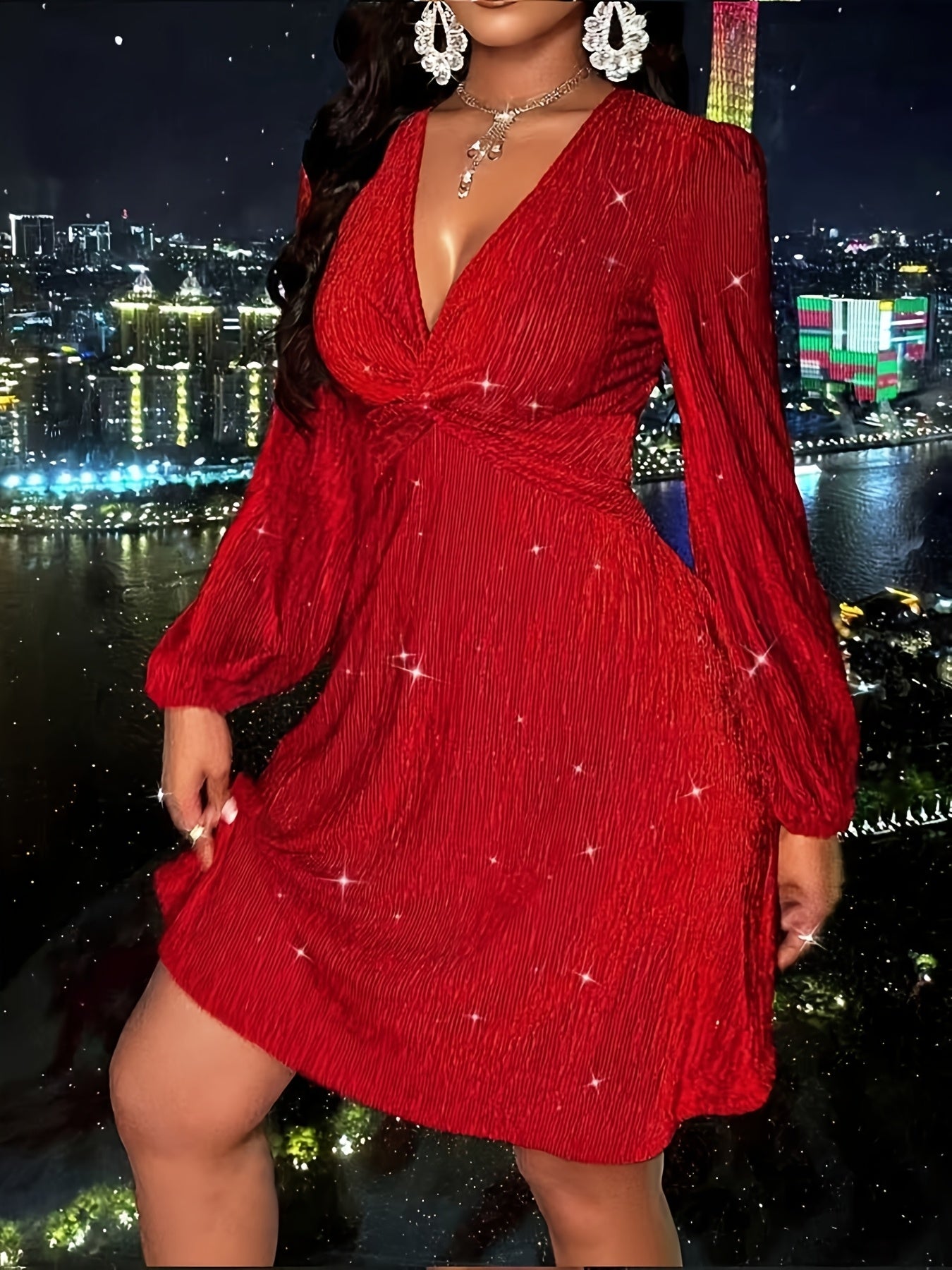 Turn heads this holiday season with this elegant deep V-neck twist-front party dress. Featuring lantern sleeves, subtle sparkle details, and a flattering A-line silhouette, it’s perfect for Christmas parties and winter celebrations.